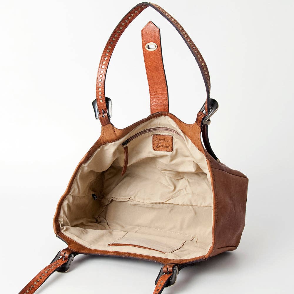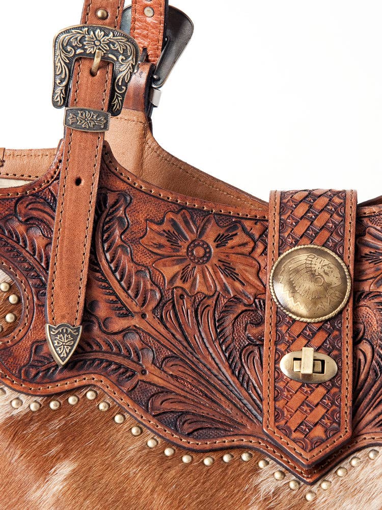 The Jane Western Heritage Tote is a stunning blend of artistry and rugged charm. Crafted from hand-tooled, carved, and antique-finished vegetable-tanned American cowhide, this tote boasts soft, full-grain leather that only gets better with age. Featuring a unique hair-on leather accent for that authentic western flair, it comes with an adjustable genuine leather shoulder strap and durable YKK zippers to keep your essentials safe. Sized perfectly at 7.75" H x 13.75" W x 6" D, it’s a playful nod to classic western style with a modern twist.
