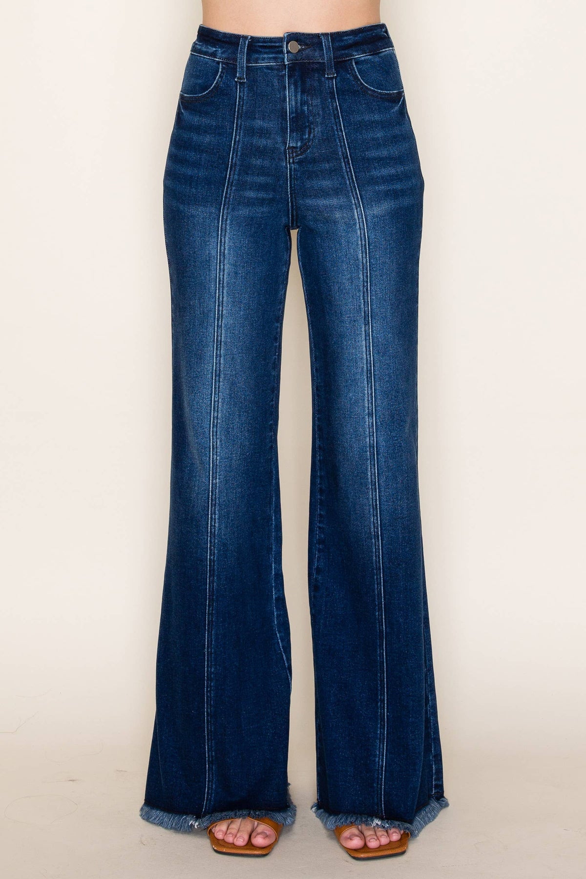 Slip into effortless style with these dark denim palazzo jeans that make a statement. The ultra-wide leg silhouette pairs perfectly with the sharp center seam detail and edgy frayed hem for that just-right vibe. Featuring a comfortable stretch fabric, zip fly with button closure, and a 34" inseam, these jeans are your new go-to for looking put-together without trying too hard.