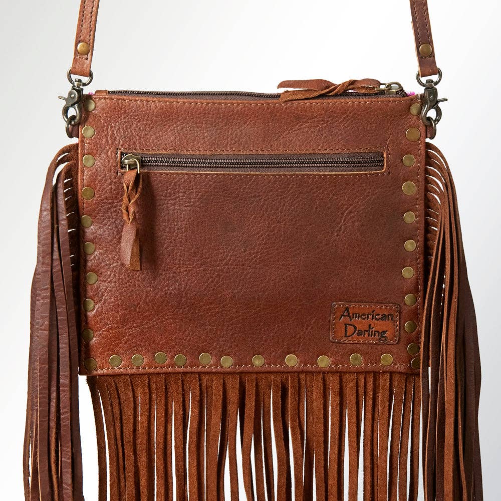 This stunning pink cowhide and leather bag brings serious western vibes to your everyday style. Featuring eye-catching fringe detailing and crafted from genuine hair-on cowhide, it's a total head-turner that blends boho charm with bold attitude. The adjustable leather shoulder strap keeps it comfy, while the trusted YKK zipper keeps your essentials secure. Measuring 8" H x 10" W, it's the perfect size for carrying what matters. Handcrafted by skilled artisans in Texas using eco-friendly leather sourced from premium tanneries worldwide, this American Darling creation is where western heritage meets modern fashion flair.
